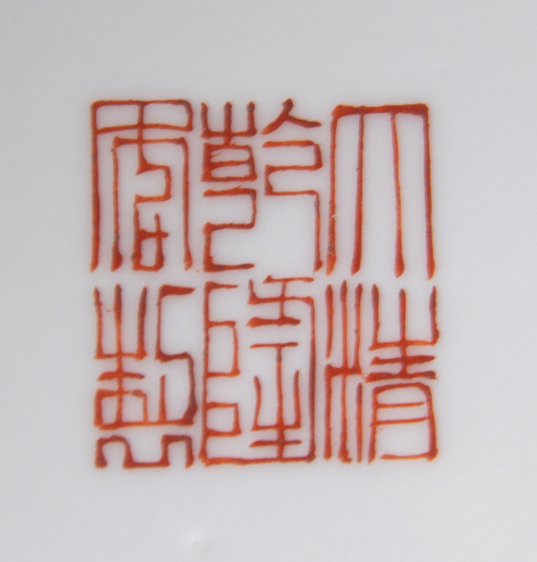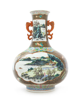 the compressed globular body decorated with shaped panels showing riverscape scenes, between a band of large ruyi heads and a row of lappets, all picked out on a black ground with gilt enameled interlocking T's, the long neck flanked by a pair of iron red glazed dragon-form handles, the underside incised with an apocryphal Qianlong six-character iron red mark.