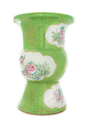 the globular body set atop a tall spreading foot, surmounted by a cylindrical neck and a dished mouth, decorated wth floriform panels enclosing flower blossoms, reserved on a lime-green ground gilt highlighted cell pattern.