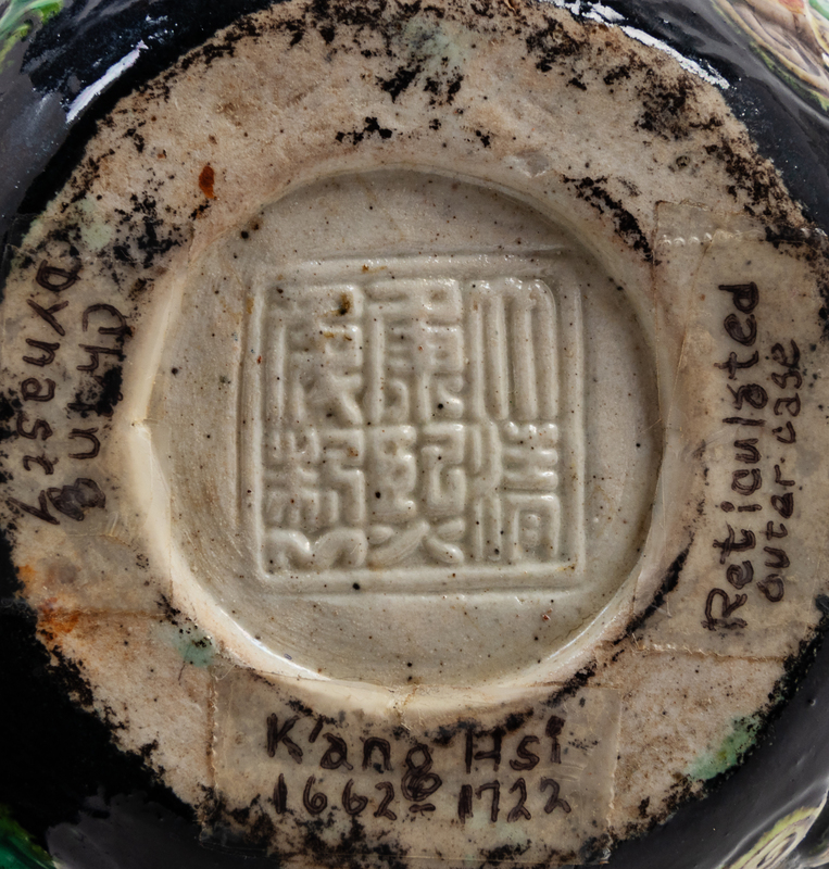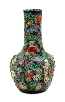 the globular body rising to a long neck and a slightly everted mouth, having reticulated decoration depicting Daoist immortals amidst auspicious clouds, the underside inscribed with an apocryphal Kangxi six-character mark within a double rectangular panel.