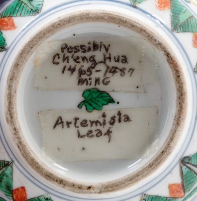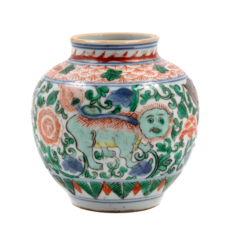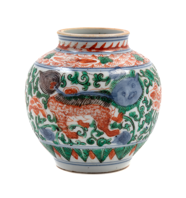 the globular body painted to the exterior depicting three mythical beasts interspersed with lotus scolls, the underside painted with a green enameled artemisia leaf-form mark.