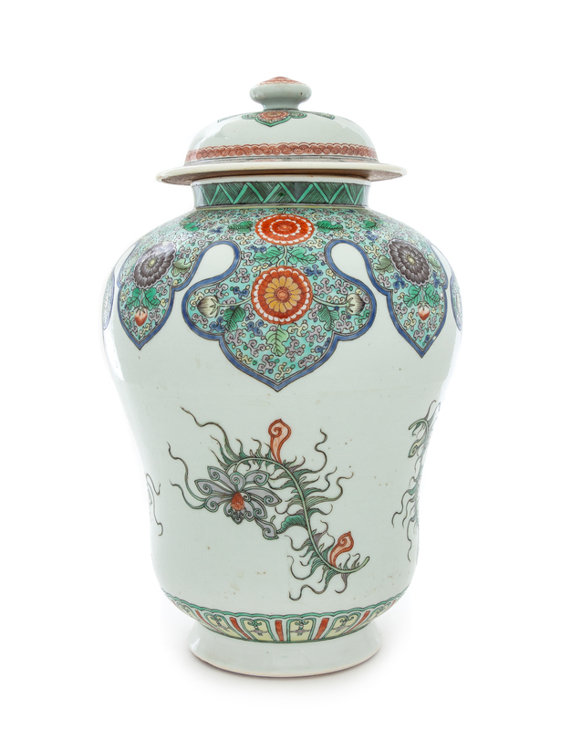 the robust body set atop a spreading foot, the broad shoulders decorated with a band of large ruyi heads filled with floral scrolls, above lotus sprigs and a row of lappets, the cover with similar decoration surmounted by a lotus blossom-form finial.