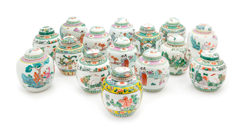 comprising seven famille verte examples painted with flowering branches, eight famille rose examples painted with figures at various tasks.