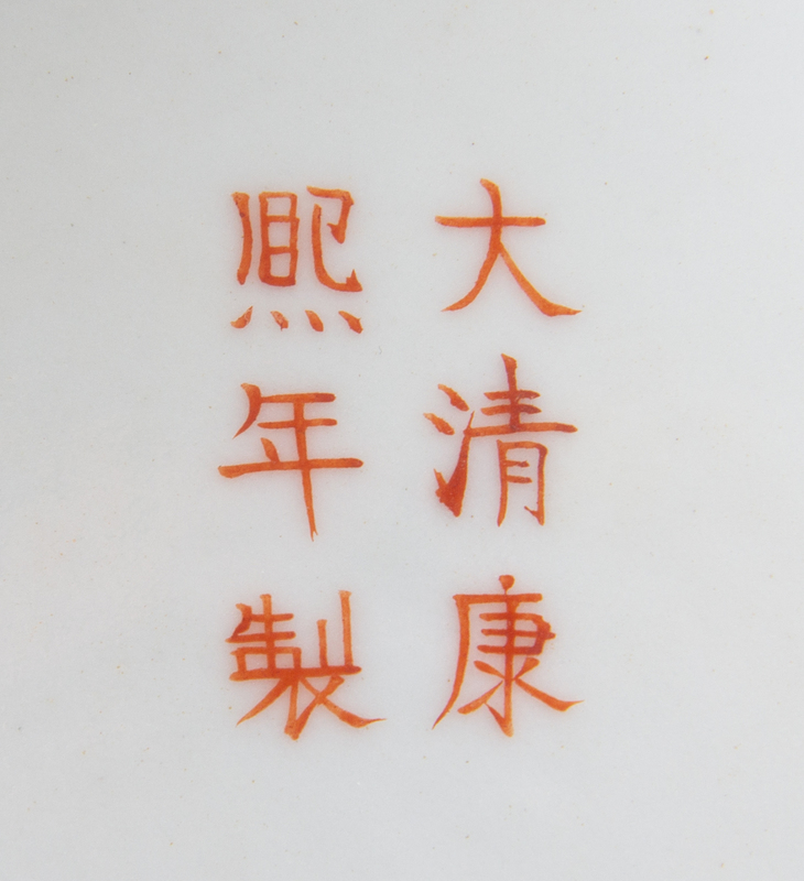 of circular form with shallow sides, the front decorated with three dragons chasing flaming pearls amongst flames and clouds, the underside incised with an apocryphal Kangxi six-character iron red mark.
