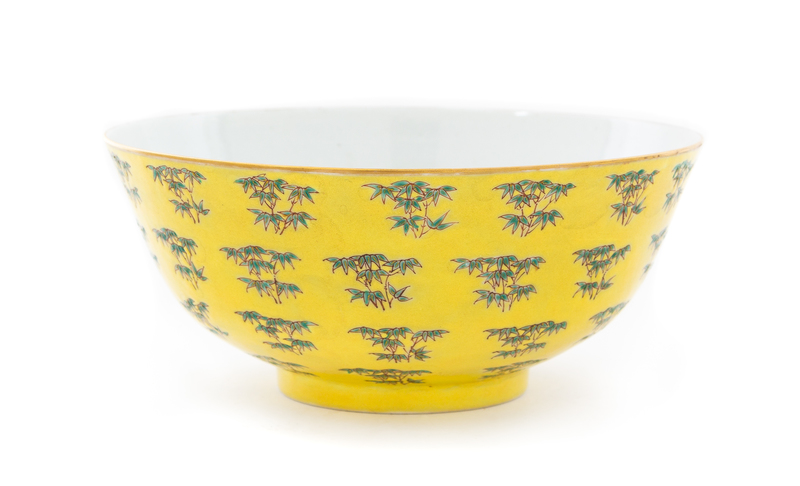 the rounded, deep walls supported on a short straight foot, having a gilt highlighted mouth rim, the exterior painted with bamboo stalks against a bright yellow ground, the underside incised with an iron red Tongzhi four-character mark.