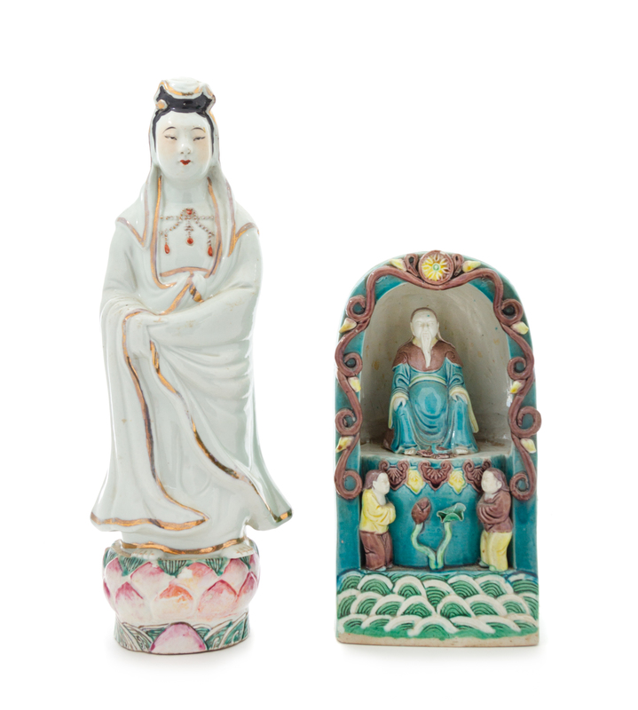 the first a famille rose figure of a standing Guanyin on a lotus throne, the second a turquoise, aubergine and yellow glazed shrine enclosing the Daoist immortal Taishang Yuanjun with two attendants.