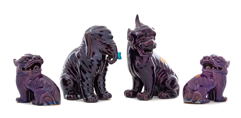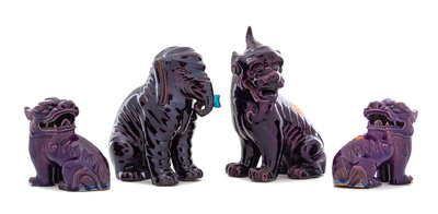 comprising a pair of figures of fu lions, each recumbent with the head turn backwards, a figure of an elephant seated on its haunch, and a figure of a bixie with its head turned to the left with a fierce facial expression.