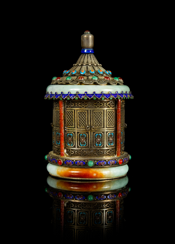 in the shape of a temple, mounted with two apple green and russet jadeite bangles mounted around the body, having green and red glass inlays, with gilt wash interior.