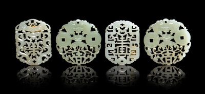 comprising a pair of reticulated examples each depicting a hanging bat flanked by two coins, suspending a chime above foliate scrolls; two rectangular examples each showing a pair of chilongs flanking a shou character above auspicious symbols.