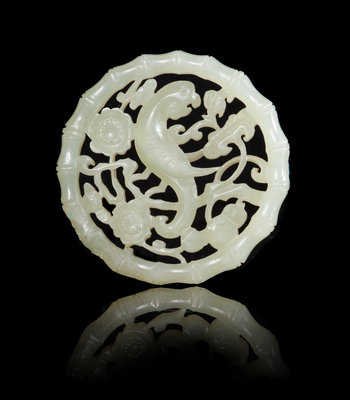 the even colored stone pierced and carved to show a magpie perched on leafy branches, enclosed by a border imitating bamboo sections.