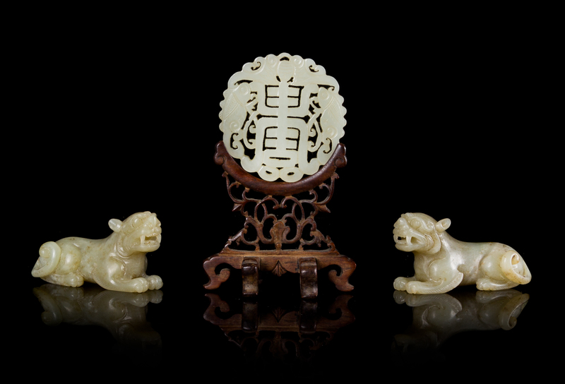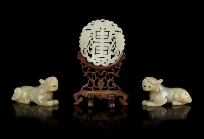 the first a pale celadon plaque openworked to show a hanging bat above a pair of fish and a shou chacter, raised on a fitted hardwood stand; the second a pair of celadon figures of recumbent beasts.