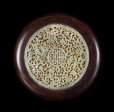of compressed circular form, the cover inset with a large celadon reticulated plaque carved to depict a central shou character enclosed by lotus scrolls and endless knots.