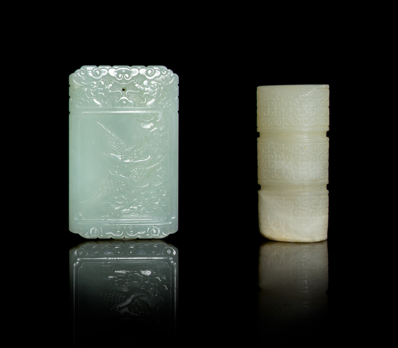 the first a pale celadon example, the rectangular plaque carved to the front showing two birds in flight, thw reverse incised with a poem followed by a two-character mark "Zigang"; the second a white stone of cylindrical form, carved with scroll motif.
