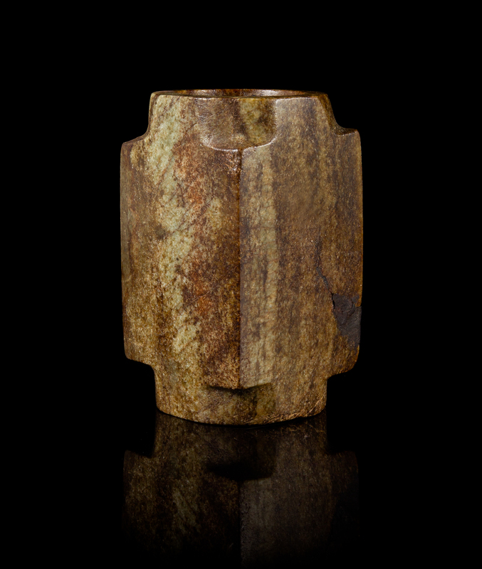 of a green stone with large areas of brown skins, the rectangular body having circular collars on both ends.