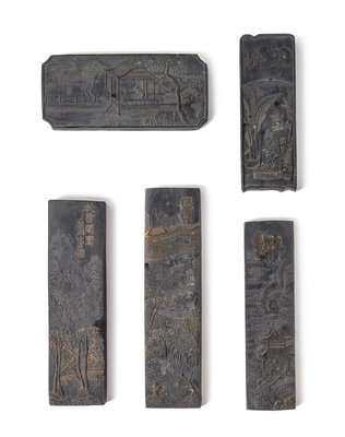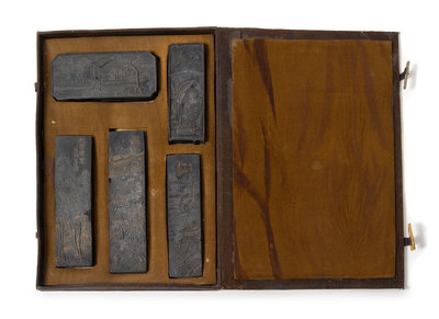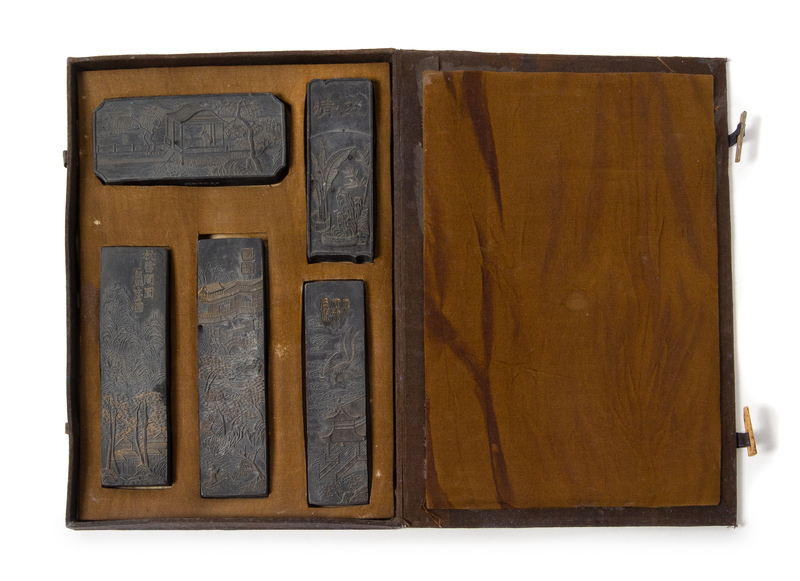 each of rectangular form, carved with landscape scenes and auspicious objects, set in a fitted box.