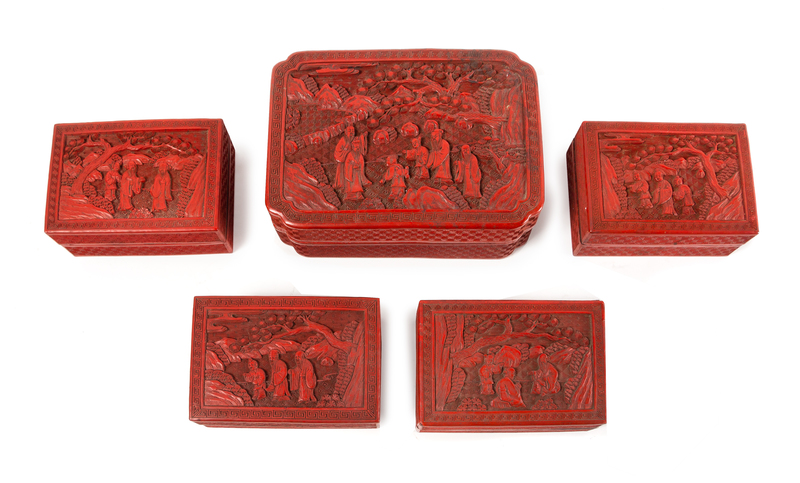 each of rectangular form, carved to show scholars in an outdoor setting.