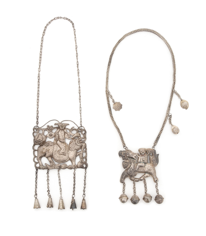 each silver chain suspending a large pendant chased to depict boys riding on the mythical beast, qilin.