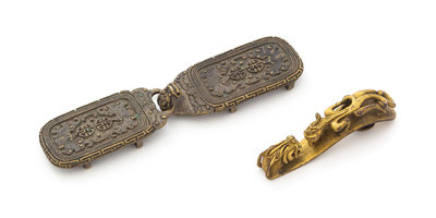 the first comprising two parts, each part of rectangular form, cast with a pair of bats in flight flanking two shou medallions, one part having a dragon-form hook, the other a loop, the reverse applied with strap-form loops; the second cast with a dragon head terminal, the shaft having a sinuous chilong.