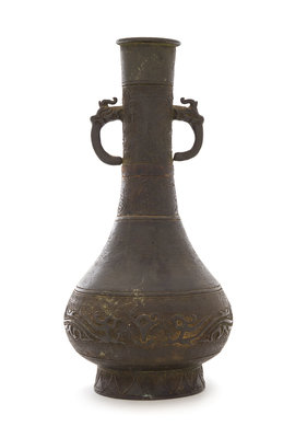 the pear shaped body cast with a leiwen band with two pairs of stylized phoenix, underneath concentric rings alternating archistic motifs to the long neck, flanked by a pair of dragon head-form handles, surmounted by an everted mouth, the slightly splayed foot cast with a band of lappets.