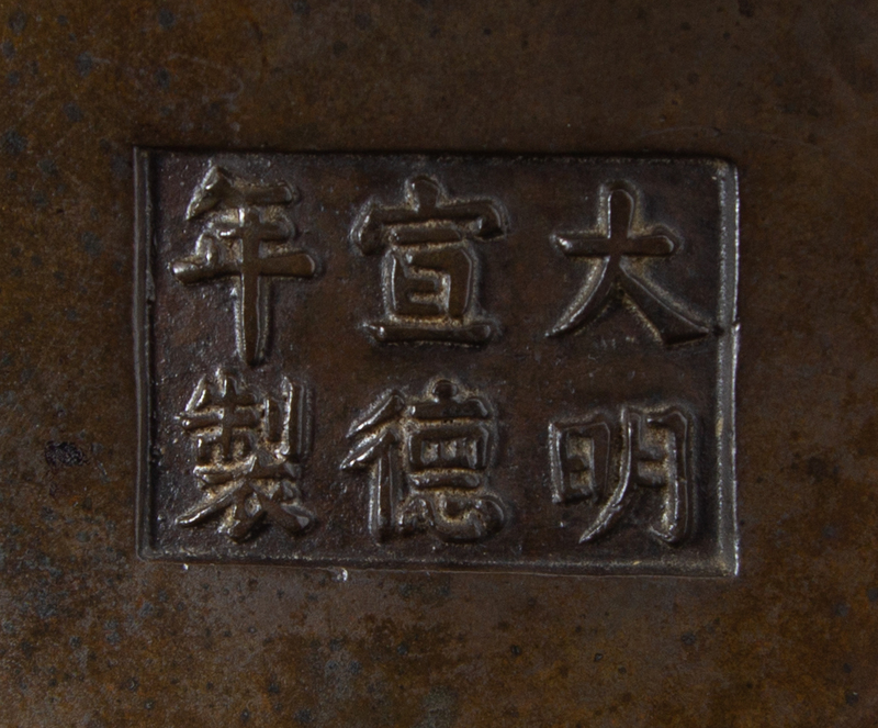 the heavily cast, compressed globular body raised on three feet, the waisted neck and lipped mouth set with a pair of everted upright loop handles, the underside bearing a Xuande six-character mark within a rectangular panel, the body covered in an attractive patina.