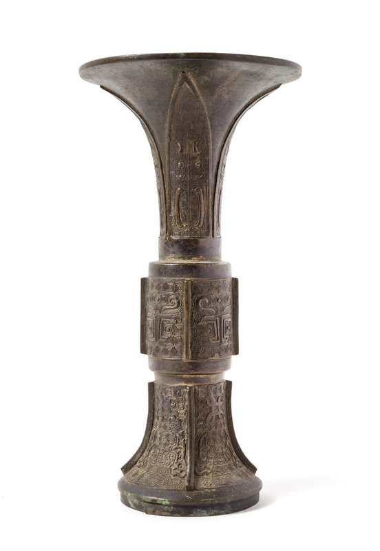 the slender body rising to a trumpet mouth, cast to depict taotie masks and archaistic motifs alternating raised flanges, below a band of lappets.