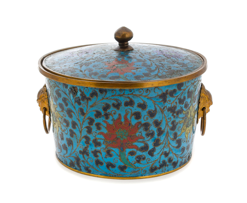 the first a covered vessel, having straigt walls, decorated with lotus scrolls against a celeste blue ground, applied with a pair of gilt metal lion mask-form handles suspending loose rings, the cover topped with a lotus bud-form finial; the second a baluster vase, decorated with flowering trees against a blue ground with interlocking T's.