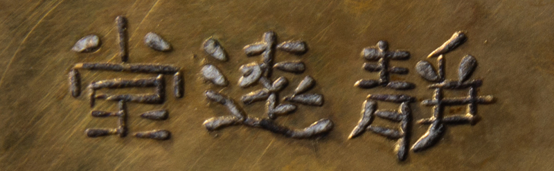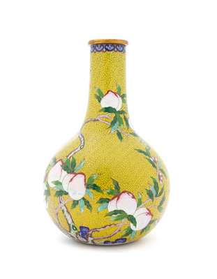 the globular body rising to a long neck and a lipped mouth, the exterior decorated with peaches borne on leafy branches between rockworks above the foot and a ruyi band to below the mouth, against a yellow ground with interlocking T's, the underside inscribed with a three-character "Jingyi tang" hall mark.