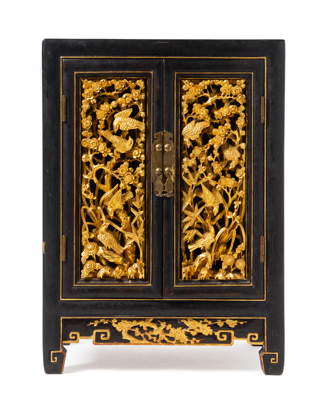 of rectangular form with a pair of pull-out doors each inset with a pierce carved gilt decorated panels depicting birds amongst flowering prunus, opening to show six small drawers and four shelves, all above a carved aprons with gilt highlighted prunus branches, raised on square legs ending in scrolled feet.