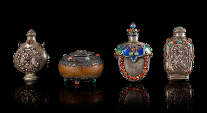 Three Tibetan Hardstone Inset Silver Snuff Bottles