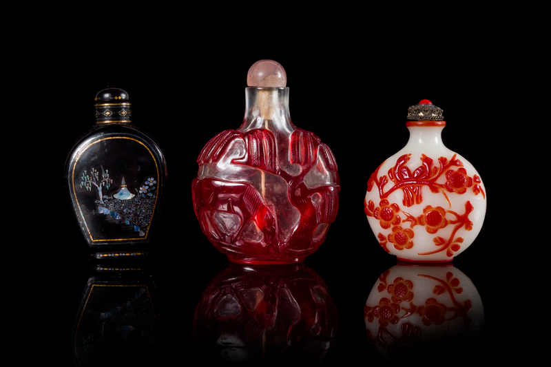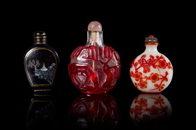 comprising two red overlay glass example, the first showing magpies perched on flowering prunus branches, the second horses underneath trees; a black lacuqer example, of flask form, painted with landscapes.