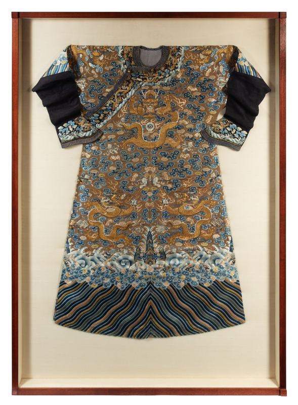 A Chinese Embroidered Silk Brown Ground Dragon Robe, Jifu