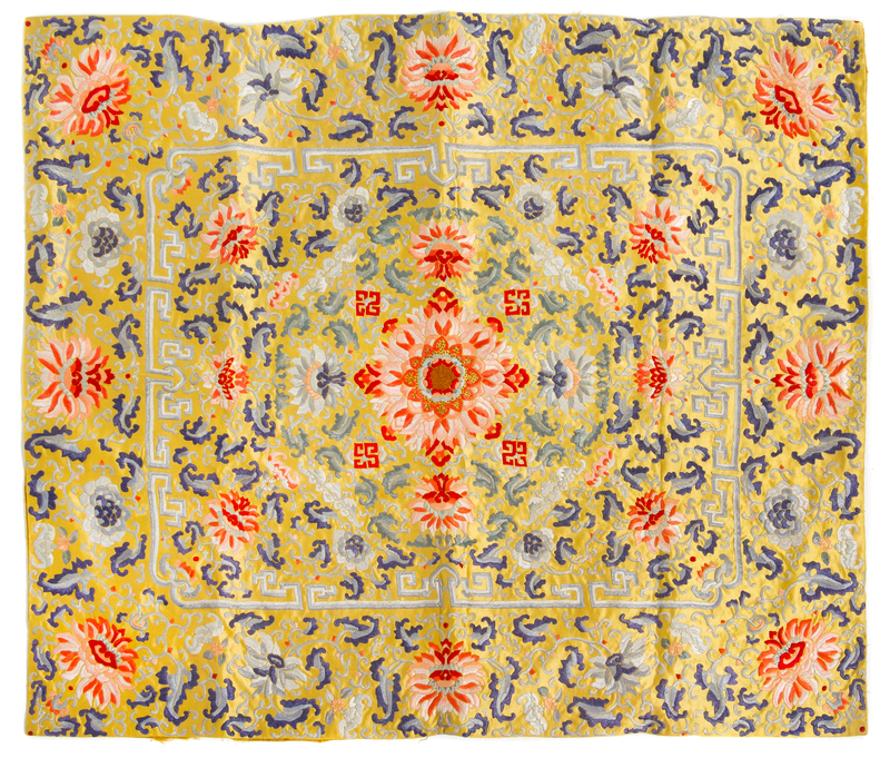 of rectangular form, worked to show lotus blossoms and leaf tendrils against a bright yellow ground.
