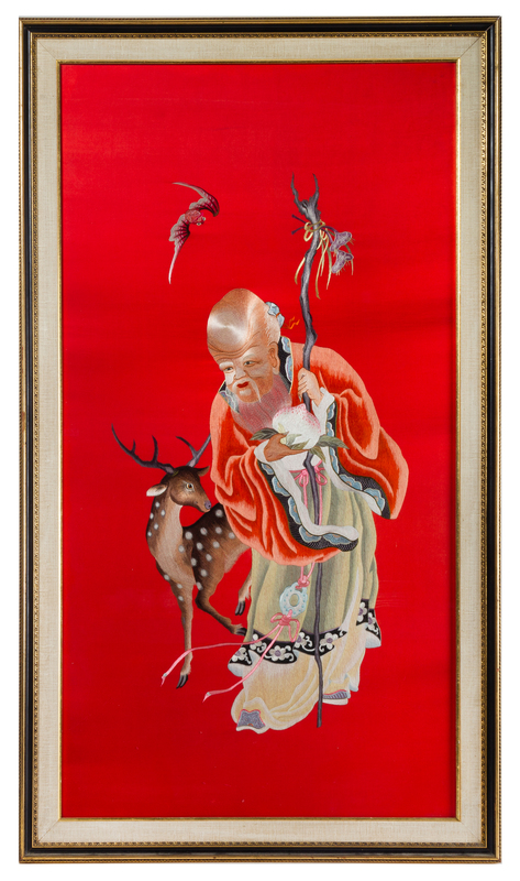 worked with multi-colored threads showing the god of longevity, Shoulao, with his deer and a flying bat, all reserved on a vibarant red ground, framed.