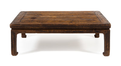 three floating panels joined and enclosed by a wide, thick frame above a recessed waist and square legs, terminating in hoof feet.