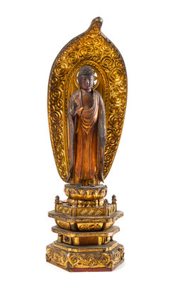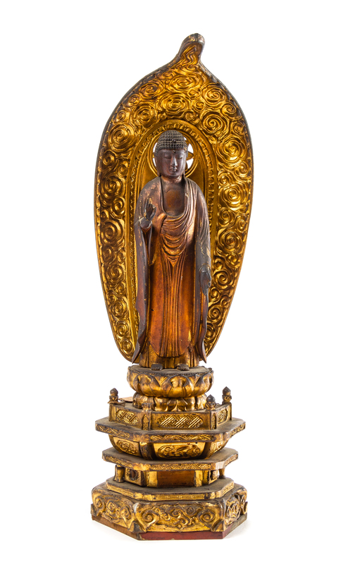of rectangular form, having a pair of pull-out doors, opening to show a standing Buddha atop a stepped throne, the right hand raised and the left hand lowered, backed by a large leaf-form mandala.