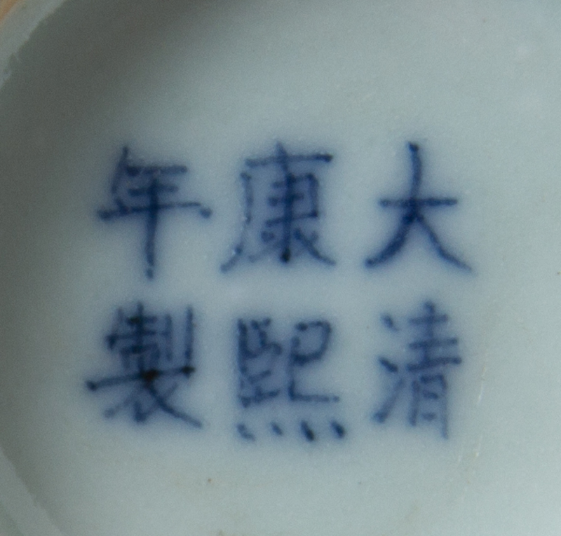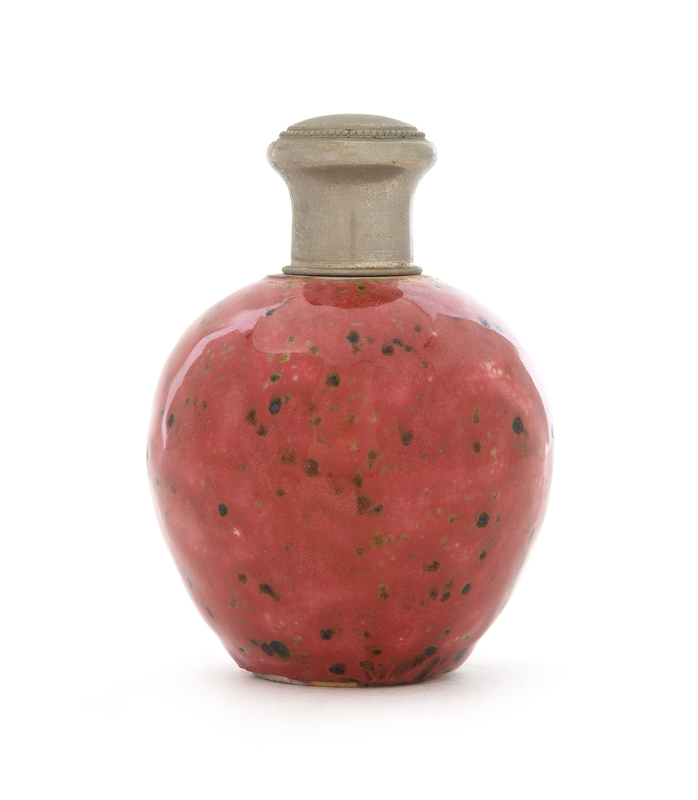 of ovoid form, surmounted by a straight neck, covered overall in a crashed strawberry glaze with green speckles, the underside incised with an apocryphal Kangxi six-character mark in underglaze blue, having a metal cover.
