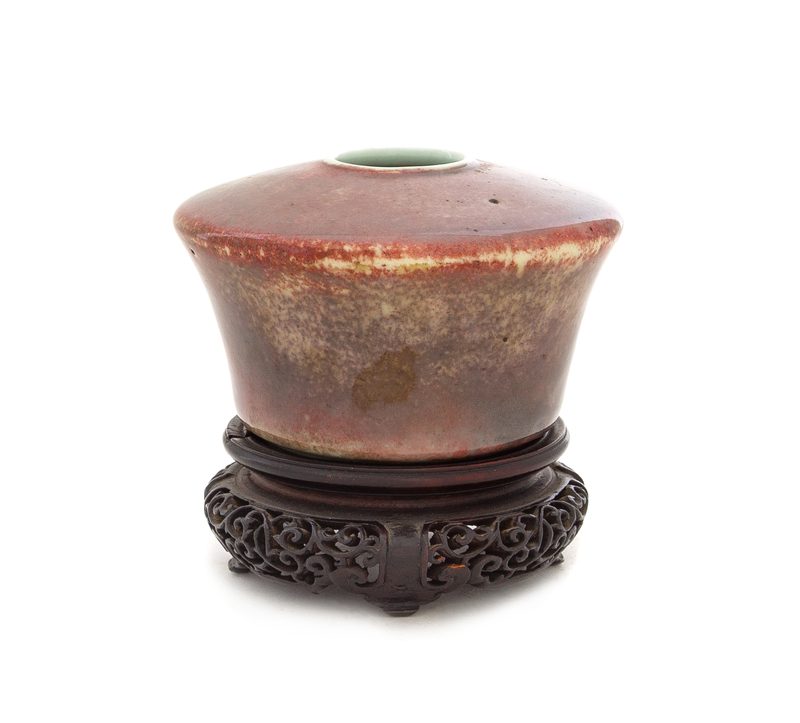 having tapering walls rising to a sloping neck, topped with a lipped mouth, raised above a hardwood stand.