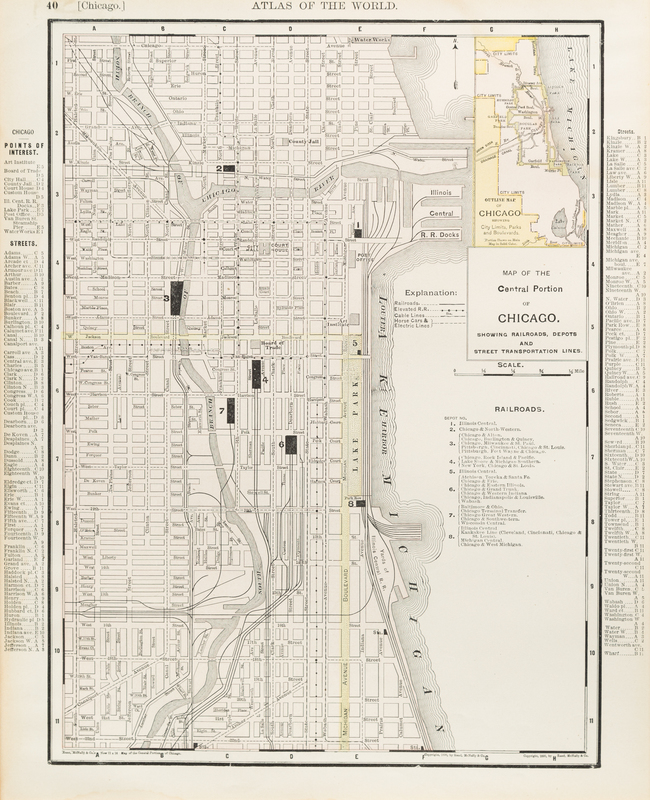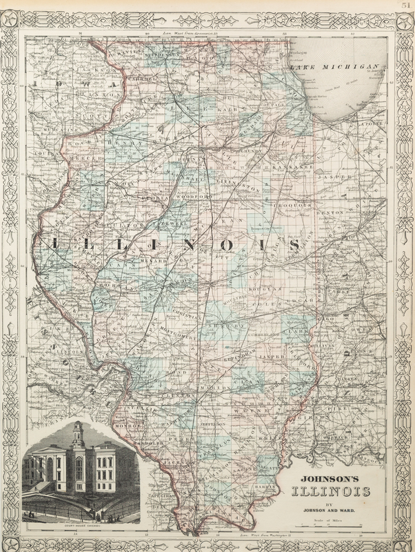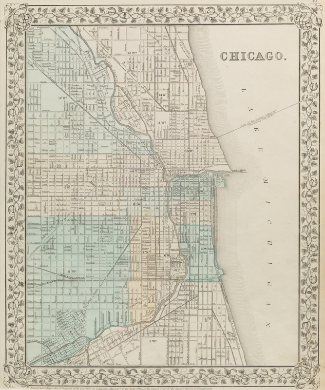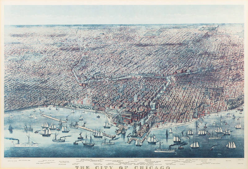MITCHELL. Augustus. Chicago. Pennsylvania, 1867. Engraved map of Chicago, hand-colored, image 13 1/4 x 11 inches. -- JOHNSON, A.J. and WARD, B. Johnson's Illinois. Johnson and Ward, n.d. A map of the state of Illinois, image 17 x 12 3/4". Small inset of the Court-House in Chicago. -- CURRIER and IVES, publisher. The City of Chicago. Lithograph, 1892, image 11 1/2 x 8 1/4". -- McNALLY, RAND. Map of the Central Portion of Chicago. Showing Railroads, Depots, and Street Transportation Lines. Rand McNally & Co., 1898. Engraved map of Chicago, hand-colored, image 12 1/2 x 9 1/4". Small inset of an Outline Map of Chicago Showing City Limits, Parks and Boulevards. -- condition generally fine, matted and framed (not examined out of frames).