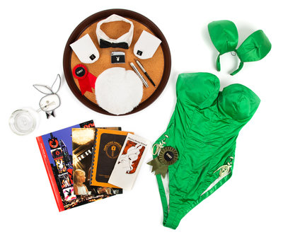 including a copy of the Bunny Manual, a Playboy Club Employee Handbook, a Playboy Club dinner menu, a Bunny study guide, a list of food service tips for Bunnies and a study guide for adhering to the Bunny image; the costume and its accessories together with a serving tray mounted with an additional name badge, tail, cuffs, cufflinks, collar, bow tie, lighter, pen and pen light; also included are a leaded glass "Bunny" souvenir, an additional cased set of cuff links, an ash tray, a set of cuffs and collar, a lighter and other ephemera.