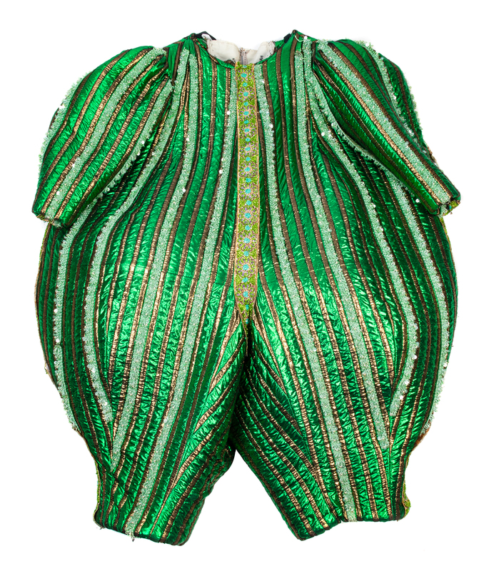1976,heavily padded throughout with metallic green and brown vertical stripes, decorative bead and sequin embellished trim and a partial back zip closure.From the Love of Three Oranges by Sergei Prokofiev. Labelled: Tirelli Costuma Roma.