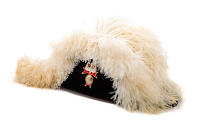 comprised of two soldier hats and a courtier hat from the 1975 production Love of Three Oranges by Sergei Prokofiev; together with a black velvet hat with plumes.Two hats labeled: Tirelli Costumi Roma.Black velvet hat labelled: Lynch & Kelly Inc.