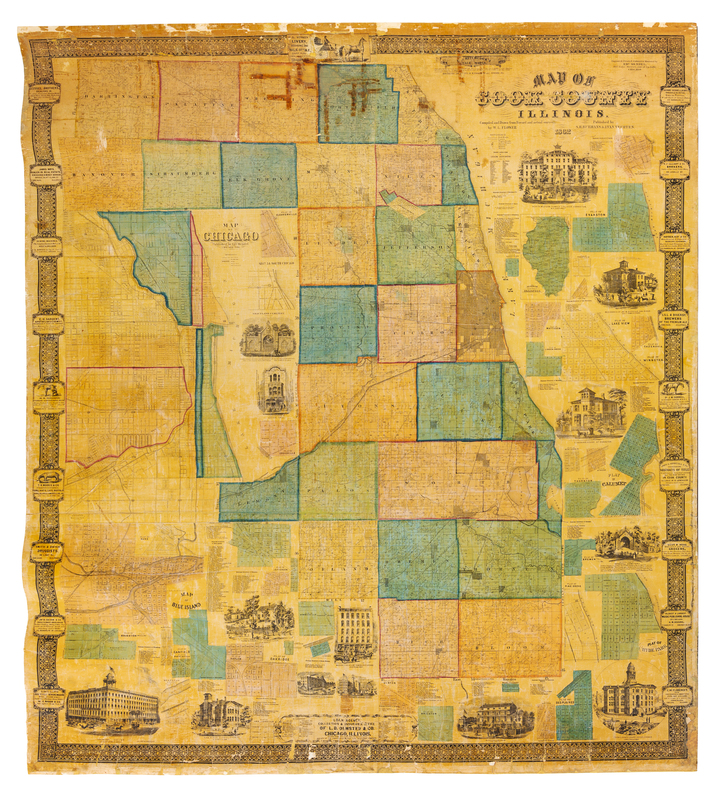 Engraved wall map with contemporary hand-coloring (1798 x 1580 mm sheet), inset maps of Chicago and Blue Island, inset diagram of the state of Illinois. (Mounted on new linen, a few tiny losses to edges, some minor staining as usual.) FIRST EDITION, ONE OF THE EARLIEST MAPS OF COOK COUNTY, A FINE COPY OF THIS PRE-FIRE RARITY"Walter Flower's enormously large map of Cook County...presents an historical snapshot of the Chicago area at the dawn of the Civil War that remains unparalleled in its richness of detail" (Robert Holland, Chicago in Maps, p.87). Borders include advertisements from Chicago merchants, and the map includes plats of over thirty towns in Cook County. The map also includes large-scale pictures of numerous properties around Chicago and Cook County, including the Tremont House Hotel, the Washington House, Bryant Hall, Graceland and Rosehill Cemeteries, J. J. Sand's Columbian Brewery, the Cook County Courthouse, Oak Ridge School in Cicero, the residences of Thomas Cook and James W. Scoville, E. Haskin's House in Evanston, and Northwestern Female College in Evanston. Streeter III: 1513.