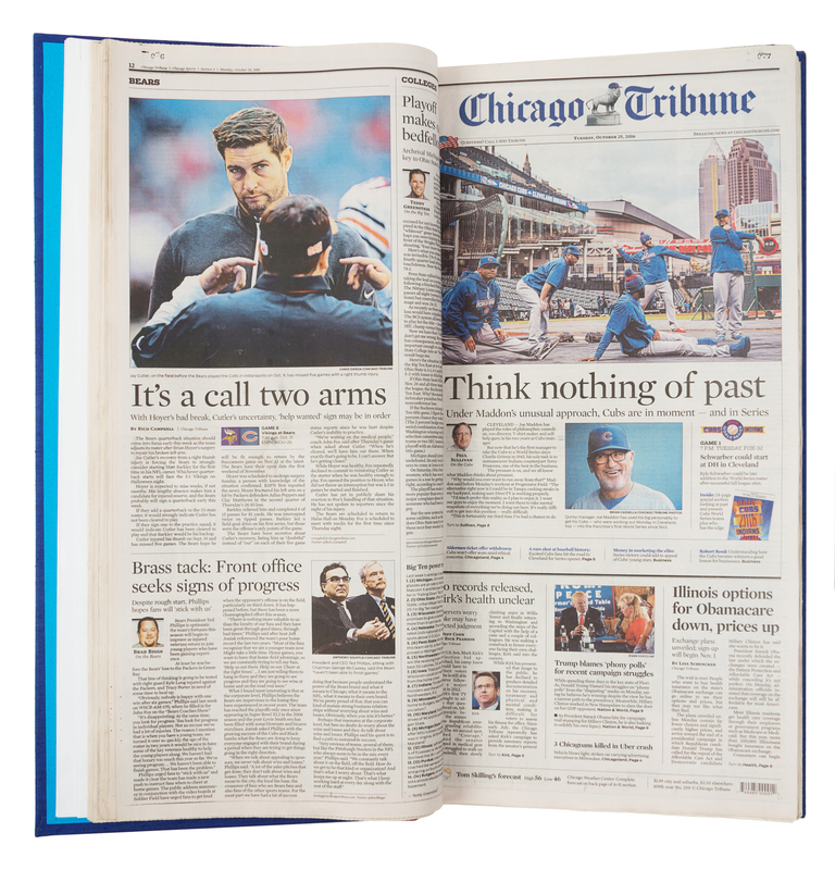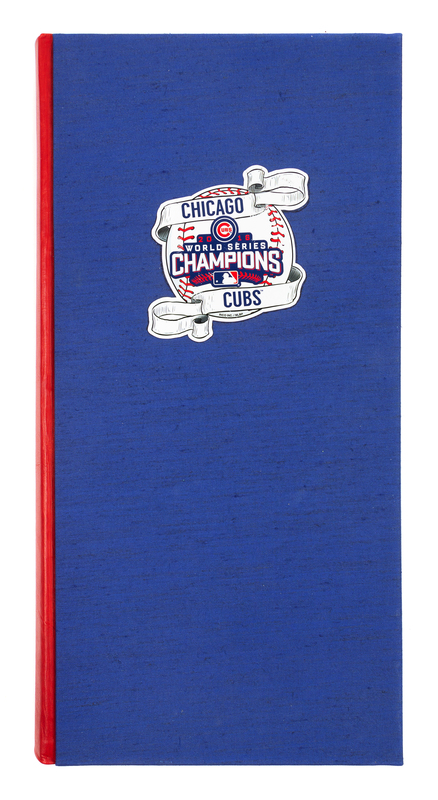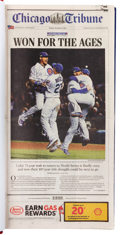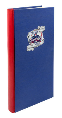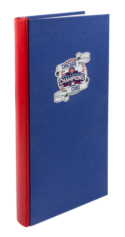 2016 World Champion Chicago Cubs: a day-to-day recap of that amazing week of October and November baseball, as recounted on the pages of the Chicago Tribune from the pens of Paul Sullivan, David Haugh, Steve Rosenbloom, Mark Gonzales and other Trib scribes and with photographs by Brian Cassella, Nuccio DiNuzzo, Armando L. Sanchez, Phil Velasquez and others. Containing the original pages of the Trib, on the original, mildly acidic, wood-pulp paper, and provided with consecutive page numbers for easy reference from the exhaustive index to the entire Cubs content. Oak Park, IL: The Boreas Press [Bob Karrow, prop.],2017. Tall folio (58 x 29 cm). Some 676 newsprint leaves, hundreds of photographs and illustrations, many in color; manuscript page numbers upper right corners, errata tipped in. Blue cloth-covered boards, decorative decal to upper cover, red goatskin spine. [In rear pocket:] CUBindex: A complete index to all articles, photographs, players, writers, photographers, coaches, fans, places, historical events, etc, relating to the Chicago Cubs, in the pages of the Chicago Tribune between 23 October and 8 November 2016. (18 x 14 cm). 56pp. Red paper wrappers. STRICTLY LIMITED EDITION, number 1 of 1 copy, carefully compiled and indexed, and bound in goat (a nod to the Curse of the Billy Goat). Includes Chicago Tribune coverage of the Cubs from Sunday, October 23rd through Wednesday, November 9th. The Cubs defeated the Los Angeles Dodgers in the National League Championship on Saturday, October 22nd, to advance to their first World Series since 1945. The Cubs' were crowned World Series Champions after winning game 7 against the Cleveland Indians on Wednesday, November 2nd in extra innings.