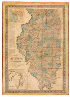 Lithographed map with hand-coloring, image 1037 x 712 mm (sheet 1102 x 788 mm). Printed within decorative borders, insets of Galena and St. Louis, untitled profile of the Michigan Canal. (Mounted on new linen, new selvage, a few closed splits just touching image.) Later issue, first published in 1836, based on surveys by J. Peck, J. Messinger, and A. J. Mathewson. The map delineates the state's transportation infrastructure, including roads, canals and rail lines, many converging on Chicago, whose role as an emerging transportation hub was one of the driving forces of growth and development at that time. The map also shows the vast expanse of the Prairie. According to Rumesy, "It is odd that with so many issues of the map, it has become truly scarce...in its time, it was the best map of Illinois by far, and was probably the most popular." COPIES OF THIS MAP ARE RARE AT AUCTION: we trace only two copies in at least 40 years. Rumsey 5030.