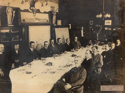 The Builders of Chicago meet in Daniel Burnham's office to discuss Burnham's plan of Chicago, 1909. Visible area 29 1/2 x 39 1/2". Matted and framed (not examined out of frame).