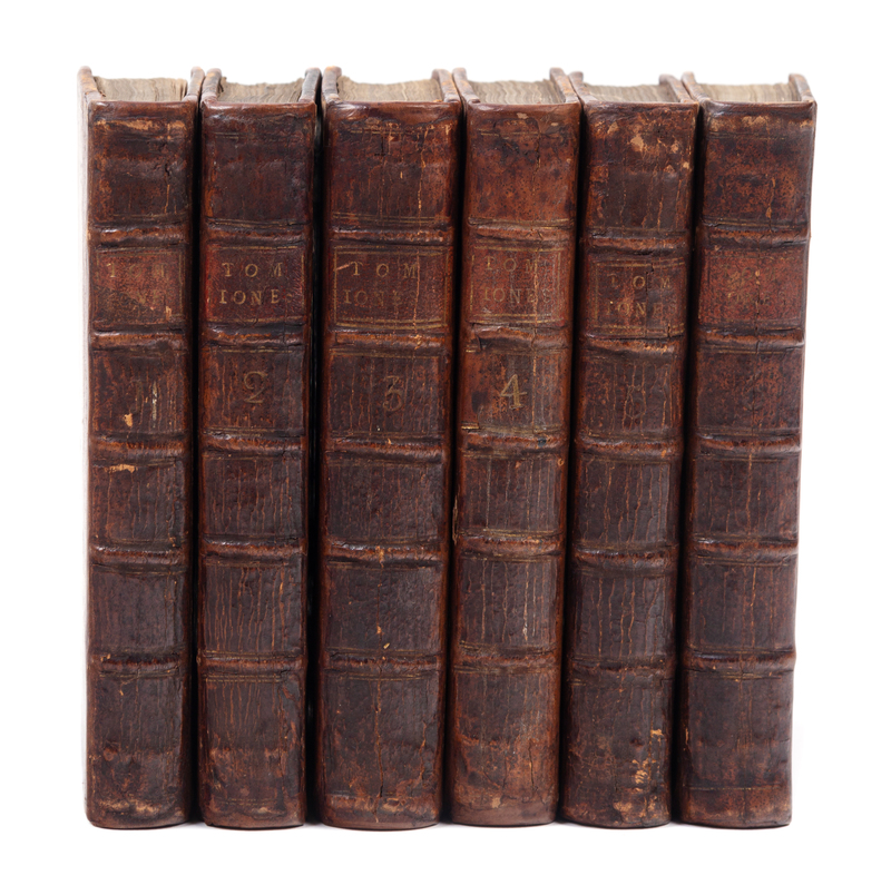 6 volumes, 12mo (160 x 95 mm). Errata leaf in vol. I; leaves B9-10 (vol. I), B4-5 and N12 (vol. II), H8-10, M3 and Q11 (vol. III), B1 (Vol. IV), N8 (Vol. V) are cancels. (A few light stains, vol.II with light dampstain to upper margin.) Contemporary sprinkled calf, spines in 6 compartments with 5 raised bands, morocco lettering-pieces gilt (discreet repairs to spines and a few corners); quarter brown morocco folding case gilt. Provenance: Frederick Edwin Smith, 1st Earl of Birkenhead (1872-1930) English politician (armorial bookplate). FIRST EDITION of Fielding's masterpiece, which was rushed to publication in 1749. As a result, the first edition contains a number of errors due to both compositor and author error. The work was immediately revised after the publication of the first edition, and the errors are addressed in subsequent editions which also omit the errata leaf (present in this copy). According to early bibliographer Frederick S. Dickson, the second edition was likely begun while the sixth volume of the first edition went to press in February 1749. ESTC T1947; Grolier English 48; Rothschild 850.
