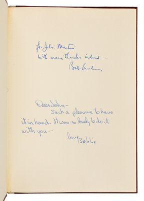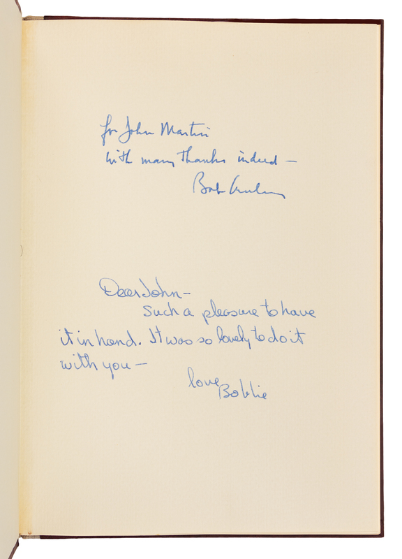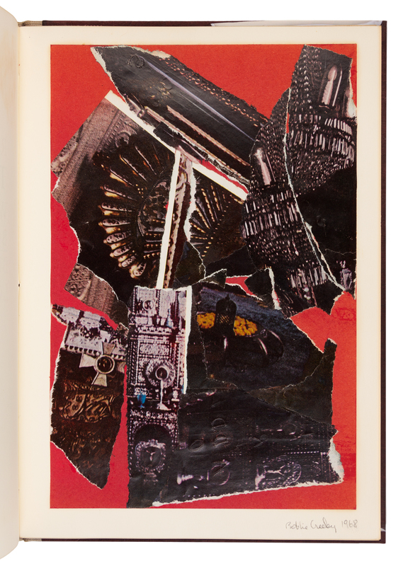 4to (254 x 179 mm). ORIGINAL COLLAGE BY HAWKINS, 4 photographic reproductions of her work (minor offsetting from original collage). Grey linen-backed boards, printed label to spine. Provenance: John Martin (b. 1930) publisher and founder of the Black Sparrow Press.LIMITED EDITION, THE PUBLISHER'S COPY, one of 50 copies hand-bound in boards with an ORIGINAL COLLAGE. PRESENTATION COPY INSCRIBED BY CREELY TO JOHN MARTIN: "For John Martin with many thanks indeed -- Bob Creely." ALSO INSCRIBED BY HAWKINS: "Dear John - Such a pleasure to have it in hand. It was so lovely to do it with you -- love Bobbie."