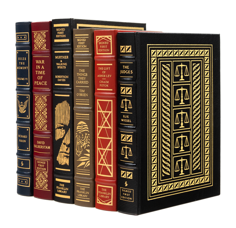 NIXON, Richard. Seize the Moment. The Easton Press, 1993. LIMITED EDITION, number 1,313 OF 1,500 copies, SIGNED BY NIXON. -- HALBERSTAM, David. War in a Time of Peace. The Easton Press, 2001. LIMITED EDITION, number 817 of 1,250 copies, SIGNED BY HALBERSTAM. -- DAVIES, Robertson. Murther & Walking Spirits. The Franklin Library, 1991. SIGNED BY DAVIES. -- O'BRIEN, Tim. The Things They Carried. The Franklin Library, 1990. SIGNED BY O'BRIEN. -- POTOK, Chaim. The Gift of Asher Lev. The Franklin Library, 1990. SIGNED BY POTOK. -- WIESEL, Elie. The Judges. The Easton Press, 2002. LIMITED EDITION, number 371 of 1,250 copies, SIGNED BY WIESEL. -- Together 6 works in 6 volumes, condition generally fine.