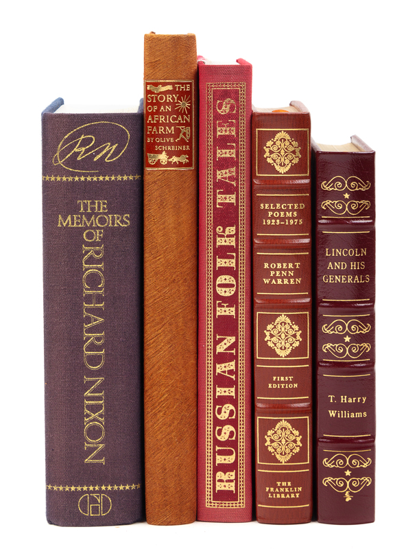 LORD, Albert B., editor. Russian Folk Tales. New York: Printed for the Members of The Limited Editions Club, 1970. -- SCHREINER, Olive. The Story of an African Farm. Great Britain: Printed for the Members of The Limited Editions Club at the Westerham Press, 1961. -- NIXON, Richard. The Memoirs of Richard Nixon. New York: Grosset & Dunlap, 1978. -- WILLIAMS, T. Harry. Lincoln and His General. Norwalk, Connecticut: The Easton Press, 1994. -- WARREN, Robert Penn. Selected Poems, 1923-1975. Franklin Center, Pennsylvania: The Franklin Library, 1976. -- Together 5 works in 5 volumes, condition generally fine.