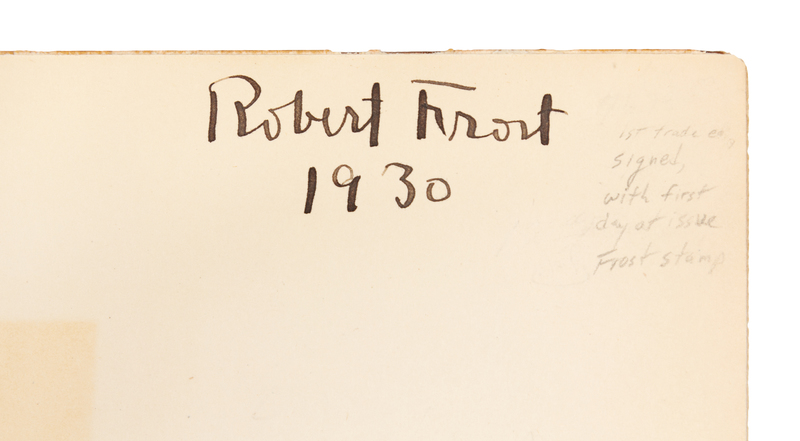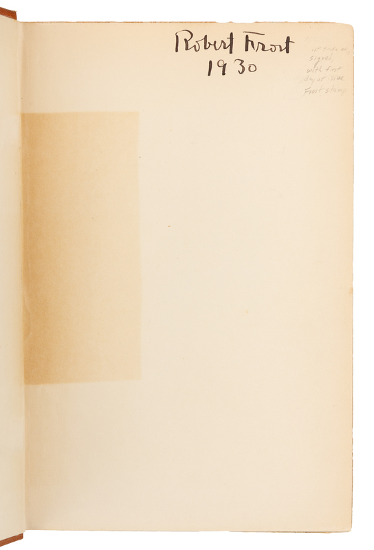 8vo. Frontispiece portrait, brown vignette to title-page. Publisher's gold-stamped brown cloth, top edge stained red, others uncut (lacking dust-jacket, some very minor wear to corners). Provenance: Elizabeth Trappan (Robert Frost stamp "First Day of Issue" partial envelope laid in). FIRST TRADE EDITION, SIGNED BY FROST on fly-leaf: "Robert Frost 1930."