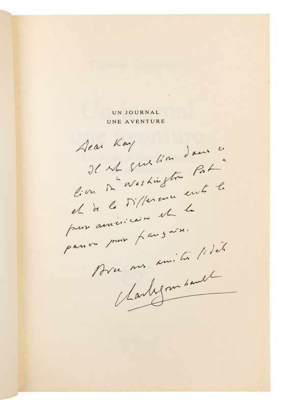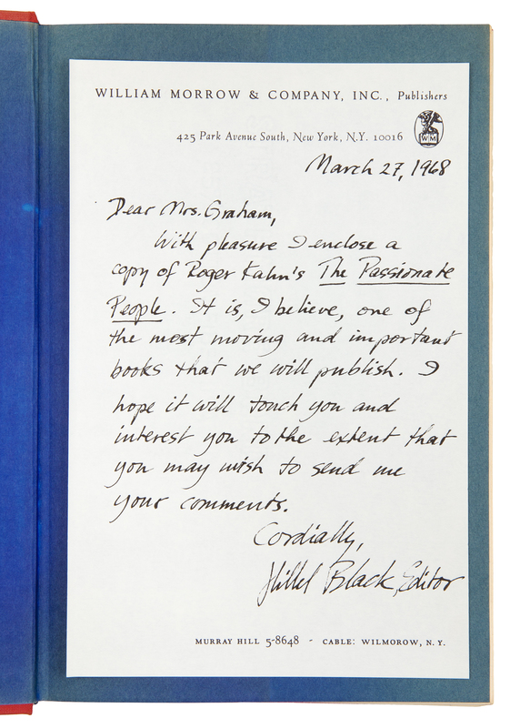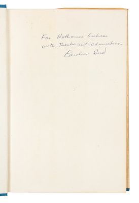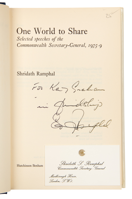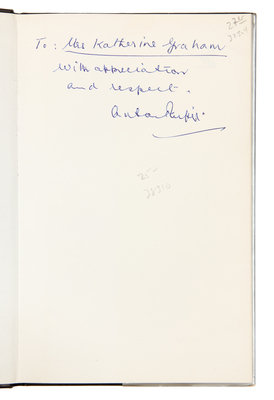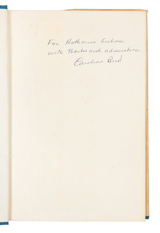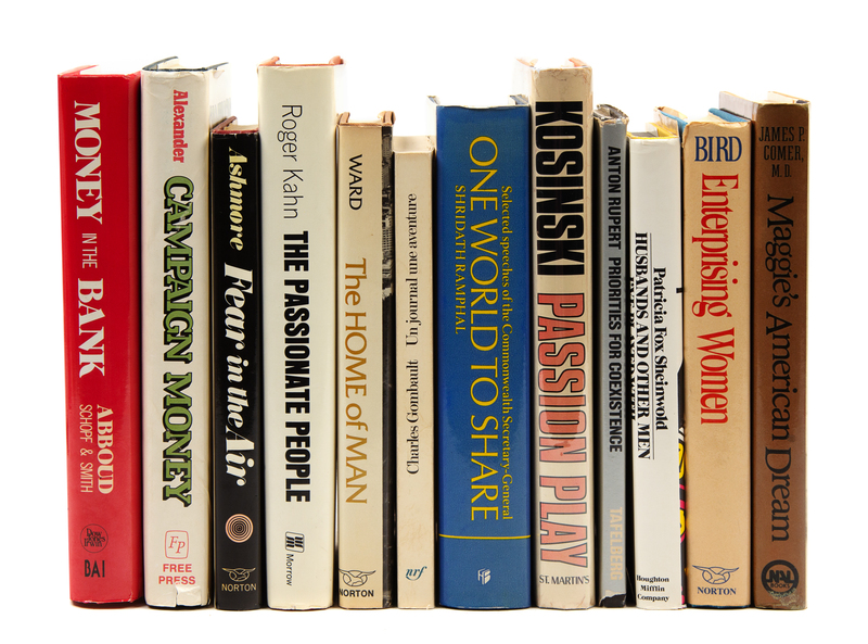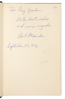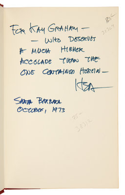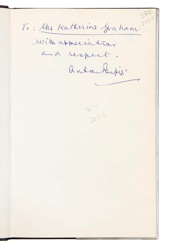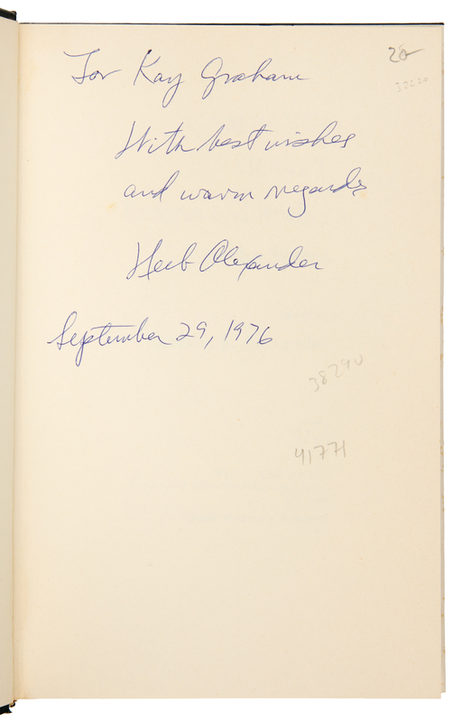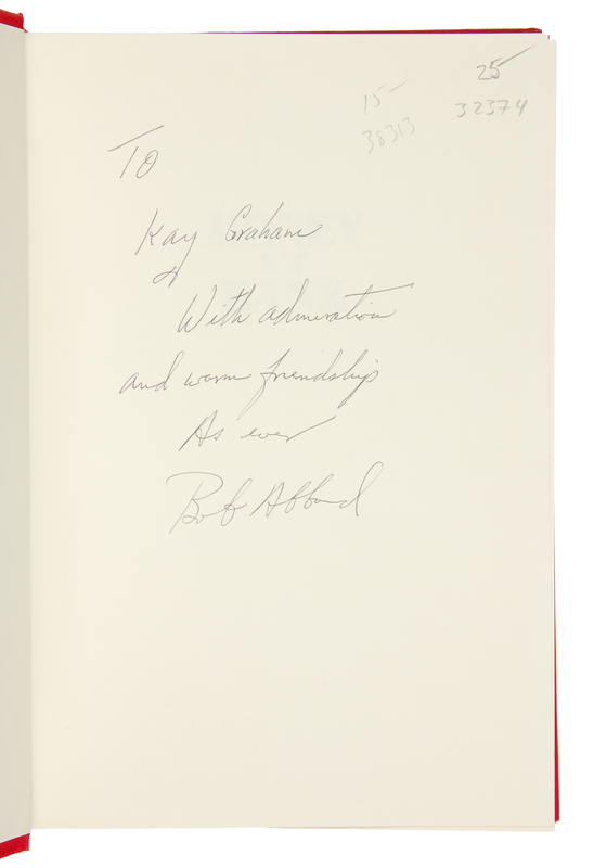 ABBOUD, A. Robert. Money in the Bank. How Safe is It? Homewood, Illinois, 1988. -- ALEXANDER, Herbert E., editor. Campaign Money; Reform and Reality in the States. New York, 1976. -- ASHMORE, Harry S. Fear in the Air. Broadcasting and the First Amendment: The Anatomy of a Constitutional Crisis. New York, 1973. FIRST EDITION. -- BIRD, Caroline. Enterprising Women. New York, 1976. FIRST EDITION. -- COMER, James P. Maggie's American Dream. The Life and Times of a Black Family. New York and Scarborough, Ontario, 1988. FIRST EDITION, FIRST PRINTING. -- And 7 others. Together, 12 works in 12 volumes, 8vo, publisher's cloth, original dust jackets (except where indicated), ALL INSCRIBED TO GRAHAM BY THE AUTHORS, condition generally fine, complete list available upon request.Katharine (Kay) Meyer Graham was the first female Fortune 500 CEO and publisher of a major American newspaper, The Washington Post. Graham controlled the newspaper for over two decades. During her reign, the Post published the content of the Pentagon Papers and covered the Watergate conspiracy, which ultimately led to the resignation of President Nixon. Graham went on to win a Pulitzer Prize in 1998 for her memoir, Personal History.